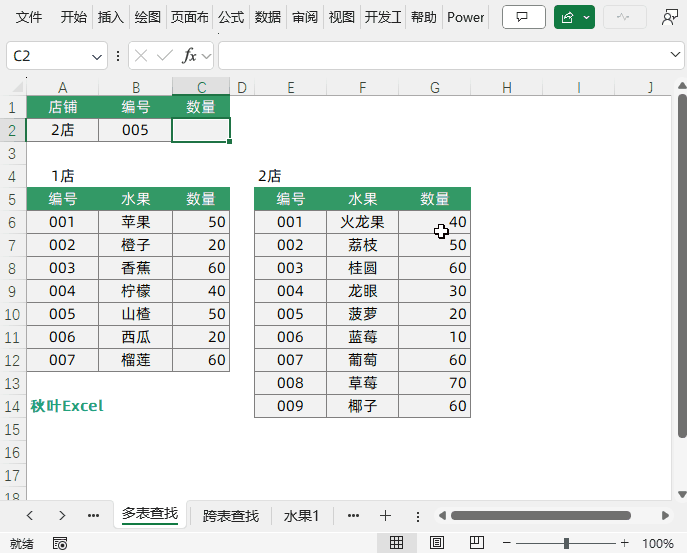 案例:不同店铺的数据放在不同的表格中,需要查找 2 店编号 005 产品的数量。