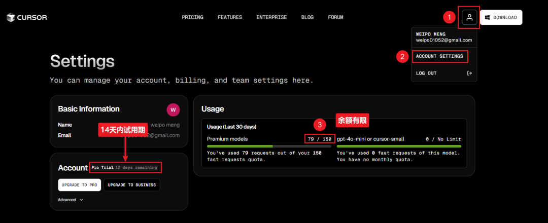 注册完成后,Cursor 会为新用户提供一个 14 天的免费试用期,在此期间,用户可以免费调用 150 次高速模型(包括 Claude、OpenAI 等顶尖大模型)。