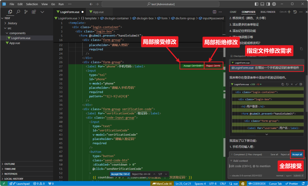 当你对生成的代码满意时,只需点击“Apply”按钮,Cursor 就会将代码写入相应的文件。Cursor 非常智能,它会自动识别代码应该写入哪个文件,你只需点击“Apply”按钮确认即可。