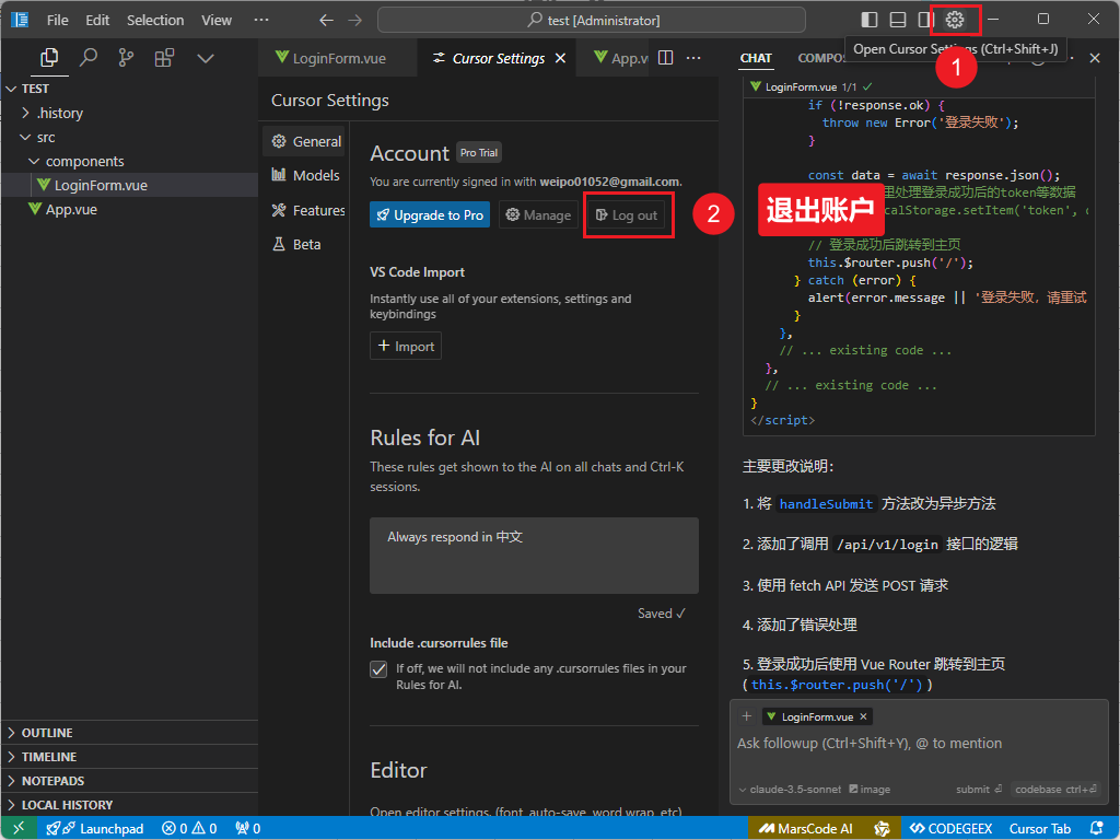 首先,在 Cursor 客户端中退出当前登录的账户。