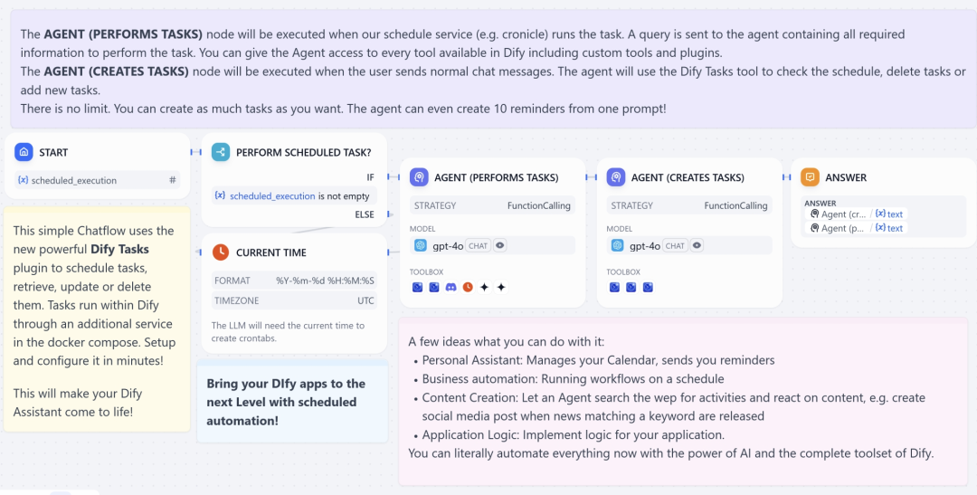 例如,通过 Agent 节点,用户可以实现类似 OpenAI ChatGPT-4o with Task 的复杂任务处理能力 (下图来自社区贡献者 Pascal)。