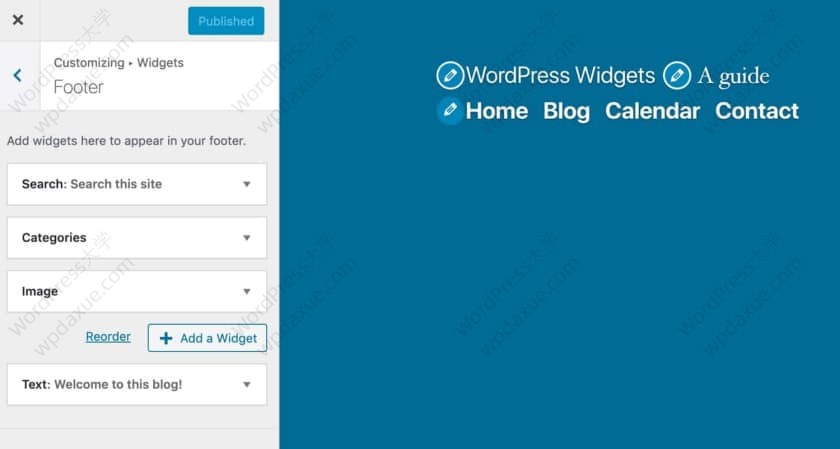 通过“定制程序”完成添加小工具后,不要忘记单击左上方的“发布”按钮,以保存您的更改。如果您不这样做就离开定制器,则所做的任何更改都不会反映在实时站点上。