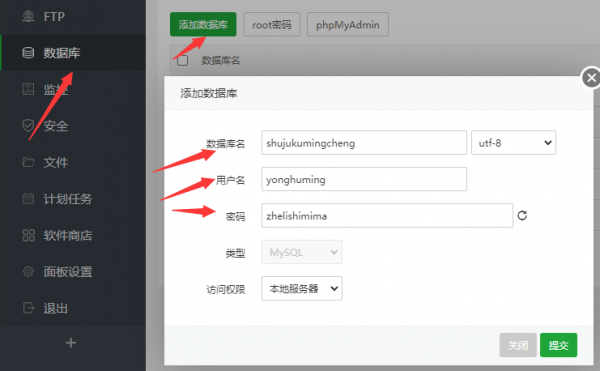 在宝塔的数据库中点击添加数据库并填写数据库名用户名密码即可(设置的尽量复杂一些)。