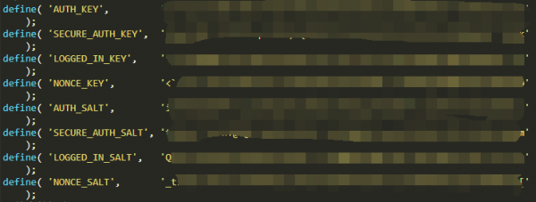 我们打开主站的wp-config.php文件将其中几行密令,复制粘贴到子目录网站的wp-config.php文件中,将子目录网站原先的这几行代码按ctrl+/注销掉