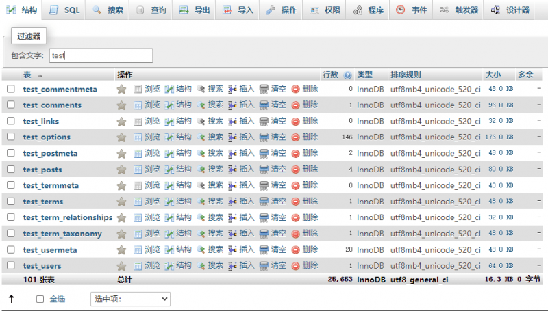 再进入phpMyAdmin选中子目录网站的数据表,也就是选择特定前缀的表进行删除。