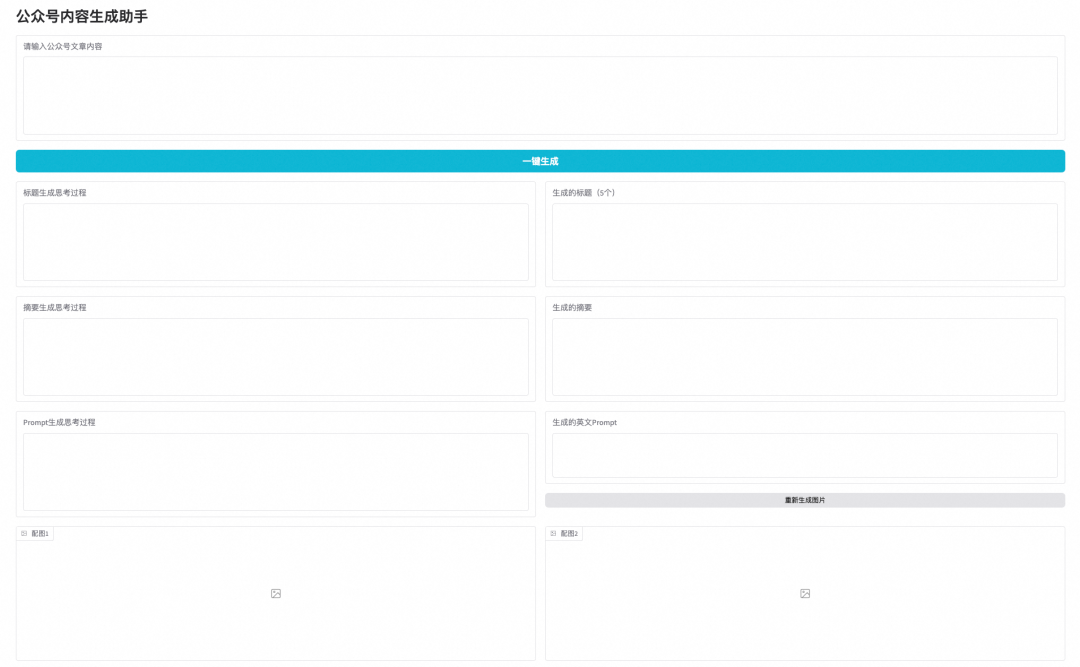 功能均可正常运行,生成的标题、摘要、Prompt 及配图符合预期。