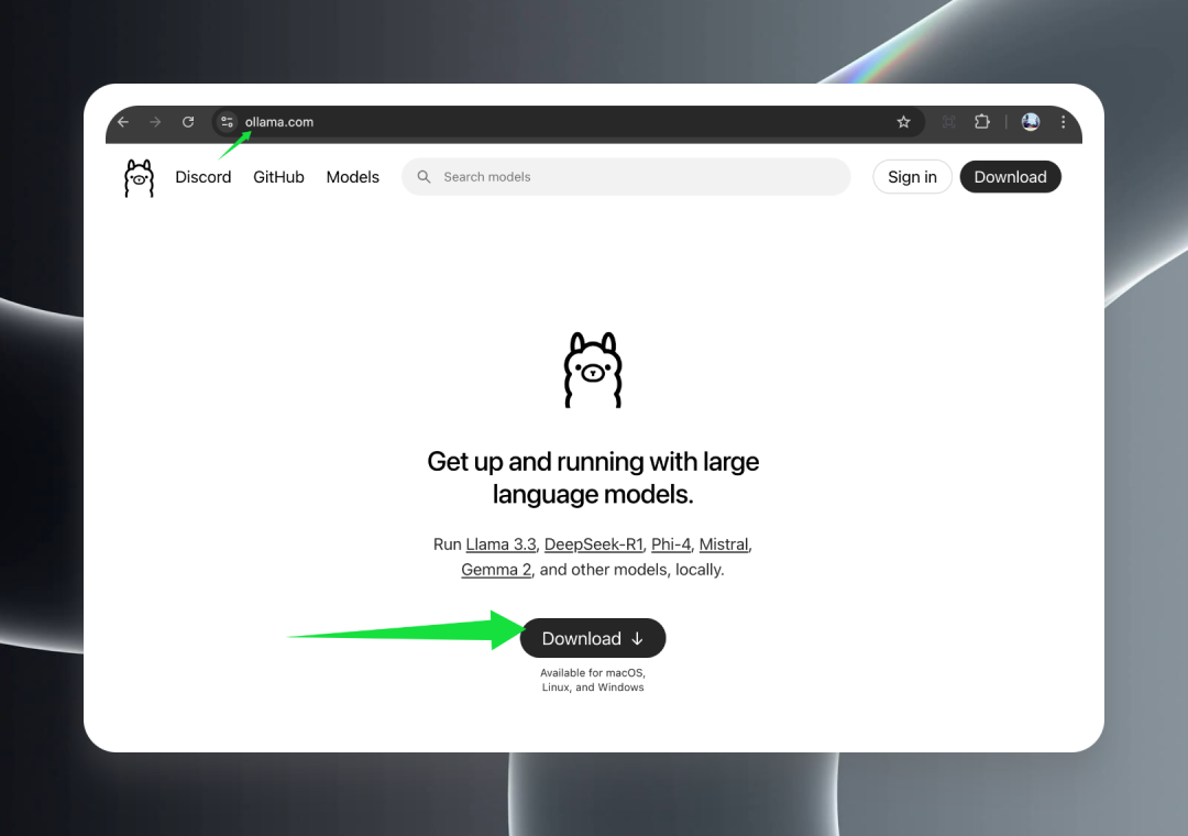 首先,访问 Ollama 官方网站 ollama.com,点击 Download 按钮,根据您的操作系统下载相应的安装包。