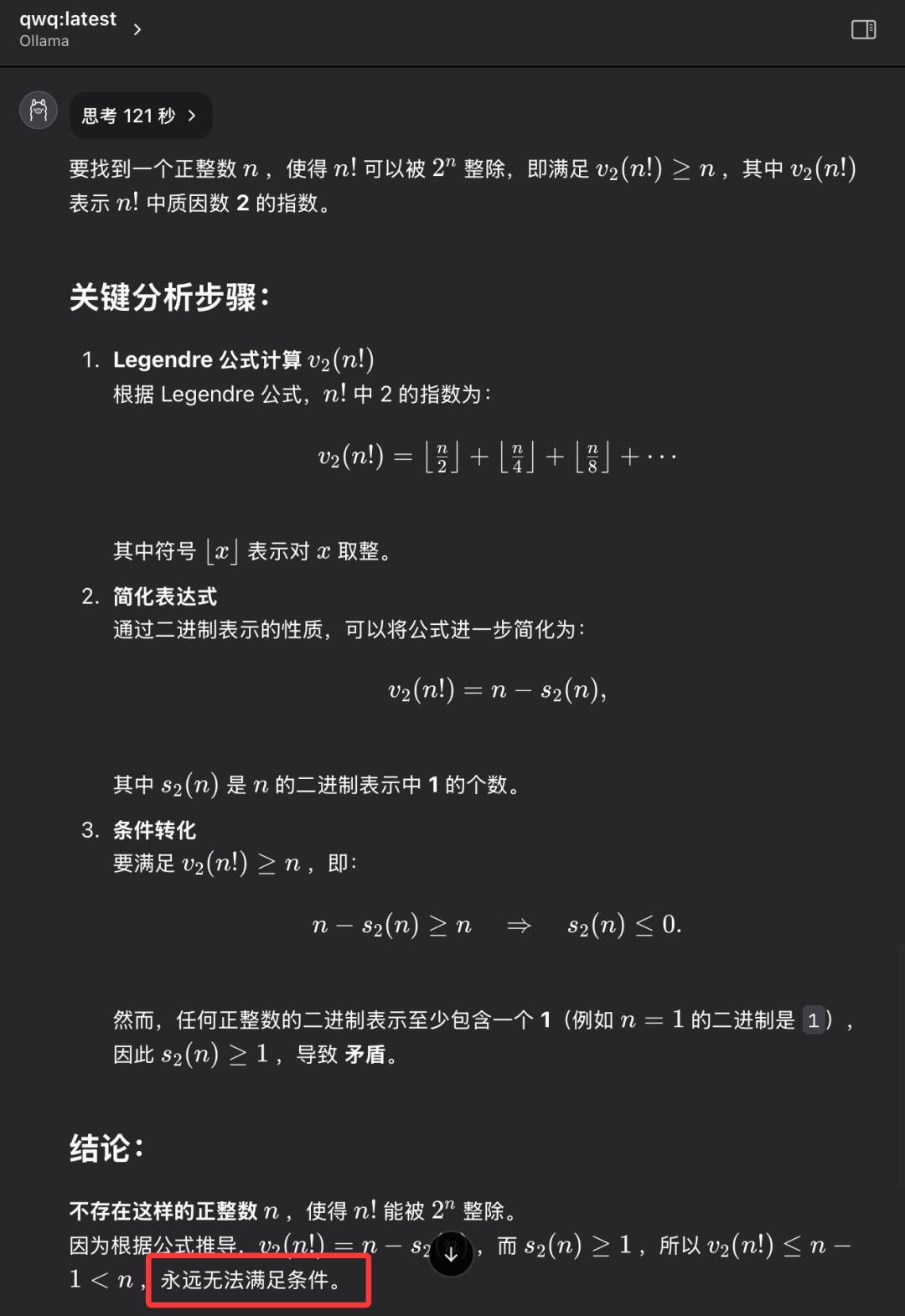 QwQ-32B 模型在 121 秒内给出了正确回答:不存在这样的正整数 n。 回答正确。