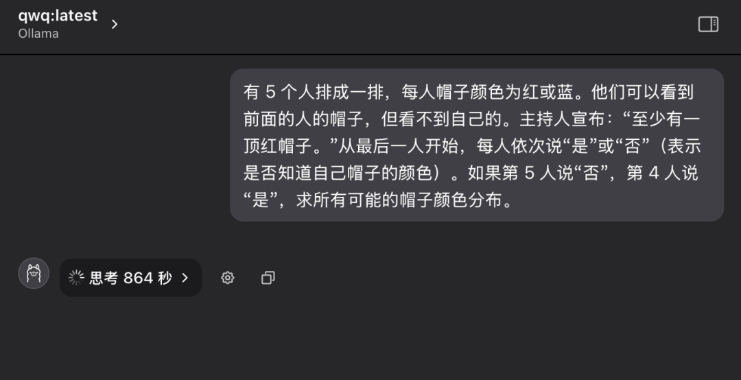 在第一次提问时,QwQ-32B 模型进入了长时间的思考状态, 屏幕上不断闪烁着 “思考中…” 的字样, 仿佛 “大脑” 正在高速运转,甚至让人开始担心硬件是否能够承受如此高强度的计算负载。 考虑到时间和硬件运行状况,在经过十多分钟的等待后,笔者手动中断了模型的思考过程。