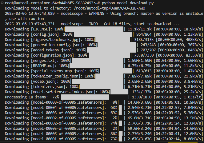 model_dir = snapshot_download('Qwen/QwQ-32B-AWQ', cache_dir='/root/autodl-tmp', revision='master')