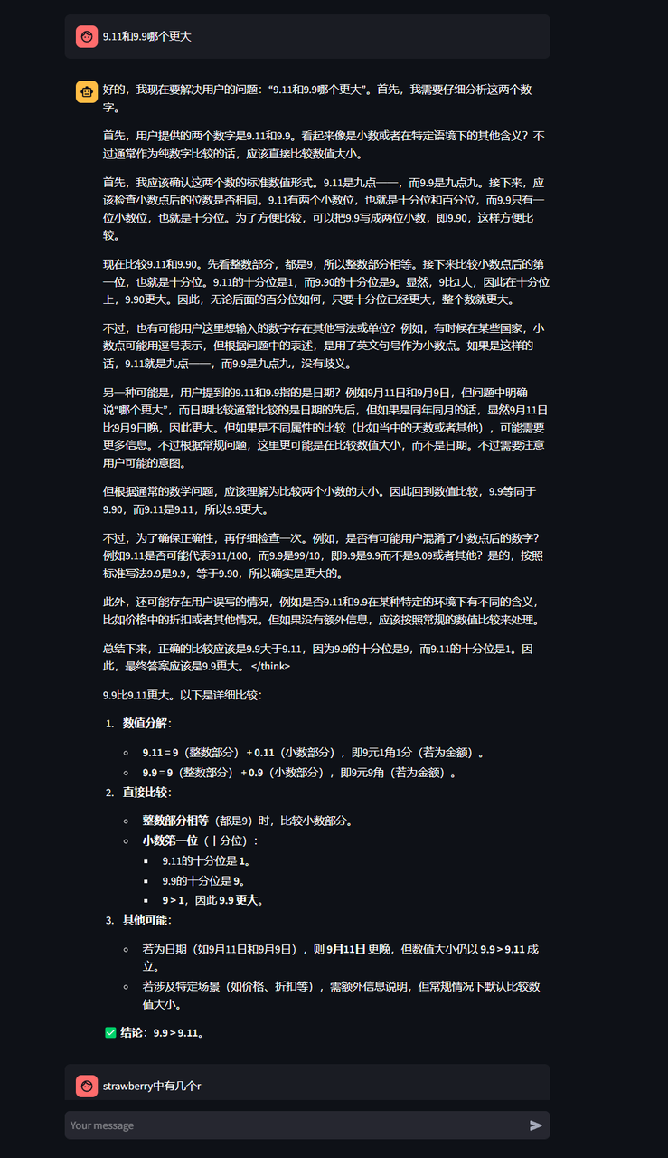 具体效果,本文不再展开对比了,效果和满血版DS 671B不相上下。