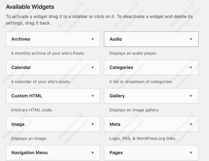 这为您提供了可用于您的站点的所有小工具列表。这将包括WordPress随附的所有内置小工具,以及您通过插件添加的任何小工具。