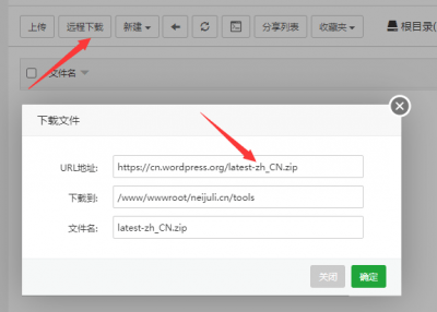 进入tools文件夹中,使用宝塔的远程下载功能(该功能将直接从官网下载到服务器上,不需要我们先下载到自己电脑上再上传到服务器上),直接下载wordpress的源码,根据服务器位置以及自身需要选择下载地址。