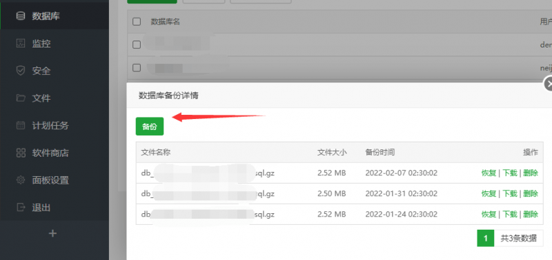 在宝塔的数据库中点击添加数据库并填写数据库名用户名密码即可(设置的尽量复杂一些)。